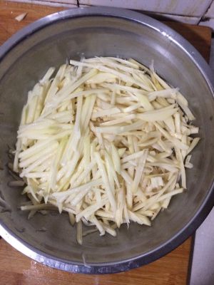 土豆刮皮,用擦丝器擦成丝。一般擦粗丝就可以,省时省力。