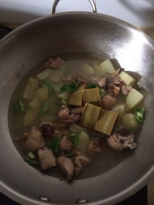 把所有的材料切成大小差不多的小块。把鸡肉焯一下,煮去血水会比较好吃。我怕土豆不容易熟,也先煮了一下。
