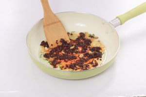 变色后,放王家渡麻辣香锅底料(或其他品牌的火锅底料,别放太多,以后不够辣再加)。 放蒜蓉豆豉酱(其他豆豉也行)和匀炒香,加糖,生抽一点,加少许温水。