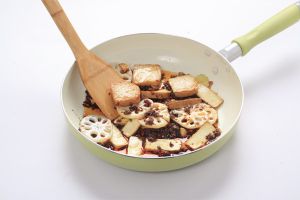 放蒜片大火爆香,再放藕片炒3 分钟左右,然后放入鱼豆腐、豆干、火腿、洋葱、虾仁炒3 分钟,再放入芹菜炒2 分钟。