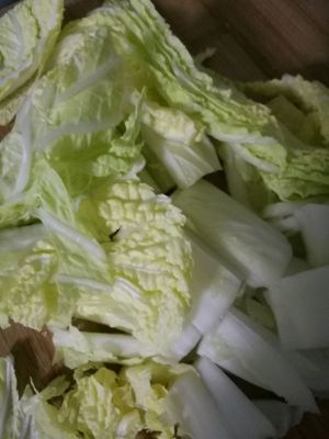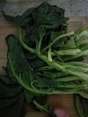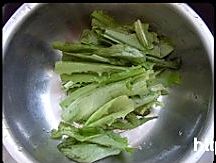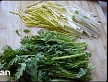 蒜黄切段,茼蒿直接切成两大段,油麦菜切大段,干红辣椒剪成段备用