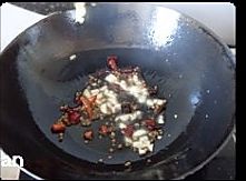 锅内在放底油,油热后放蒜末,干红辣椒,麻椒炸出香味