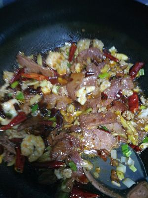 将油烧热后倒入葱姜蒜红辣椒呛香,加入麻辣香锅料,而后转中火倒入虾,牛肉炒两分钟。(因虾,牛肉之前已在电饼铛中煎过,此时不宜炒太久)。