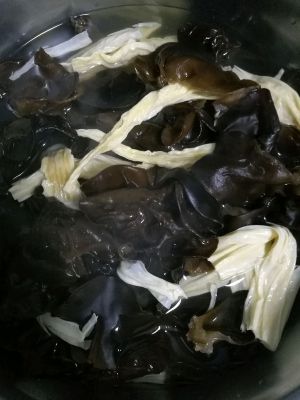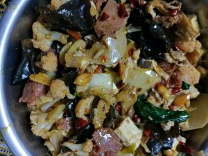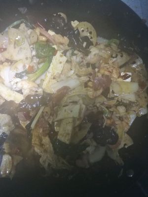 放黑木耳,焯好的菜花和藕片,刚才炒好的青菜