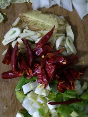 锅里倒油加热,放辣椒,花椒,葱花,姜,蒜爆香