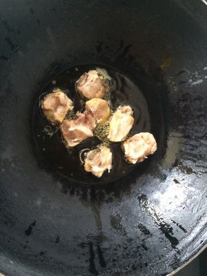 锅内放入油,油热把排骨下锅炸第一遍,呈金黄即捞出。