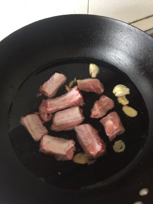 排骨和姜蒜都放入锅中 排骨洗净无需焯水这样做出来的排骨肉比较嫩 倒入清水 没过排骨即可