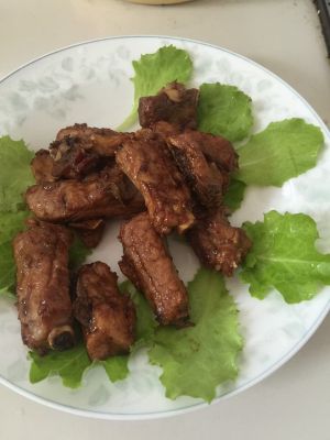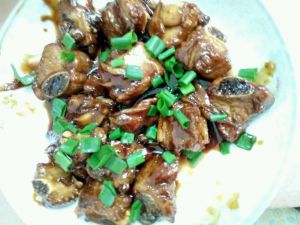 汁快没了,就勾芡淀粉在里面加入鸡精调料浇在排骨上面,然后收汁装盘【请忽略上面的装饰因为我不喜欢香菜。有芝麻可以撒点芝麻】