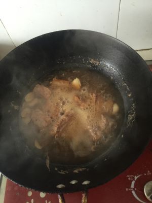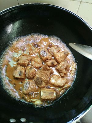 倒入刚才调好的酱汁,刚好莫过排骨就行。盖上盖子焖煮……