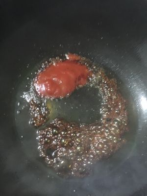 4.锅中起火倒入油加入冰糖溶化后再倒入番茄酱;