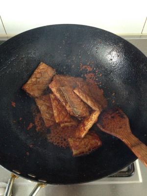 放入带鱼加半碗水,翻炒均匀煮一分钟,加入少量薄薄淀粉水勾芡即可