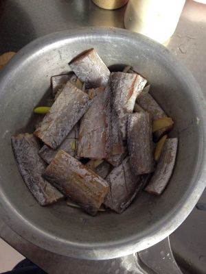 带鱼洗干净,去除内脏并洗干净肚子里黑色的膜,表皮的鳞用刷子轻轻刷干净,再沥干水。中午洗下午沥水晚上吃。