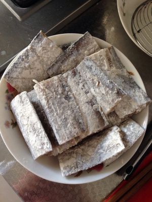 腌制好以后将带鱼段用厨房用纸吸干鱼身上的水,然后薄薄的裹上一层干面粉