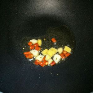 油烧热后,倒入配料煸炒出香味(大火40秒)