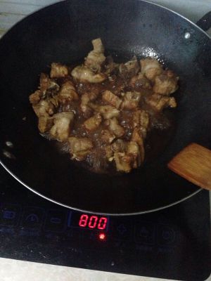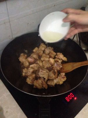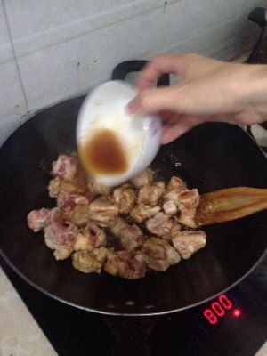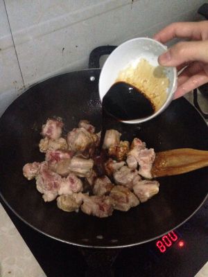 加入沥干水的排骨翻炒,使糖均匀裹上排骨,炒干水分,约一分钟左右将电磁炉调至800kW,随后加入其余酱料。