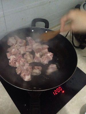 下排骨,继续翻炒,直至排骨、瘦肉变色,没有血色