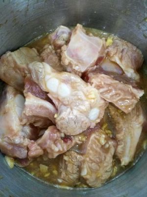 排骨过水 去血水浮沫 加糖 醋 葱 姜 腐乳盖保鲜膜放入冰箱腌制2~3小时 时间富裕可过夜