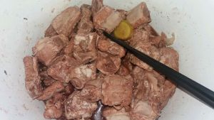 3、沥干水的排骨,加入盐、老抽、生粉、料酒,搅拌均匀。腌制大概10分钟左右