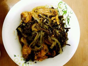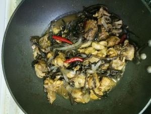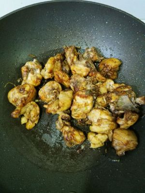 葱切段,姜切片爆锅,放大料,鸡肉翻炒至金黄,加白糖和海鲜酱油翻炒上色