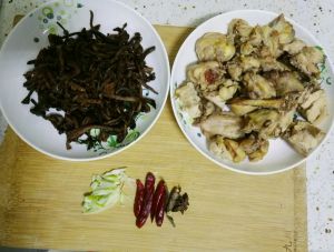 小鸡洗净用热水焯一下,去血水。臻蘑适量用水泡发洗净。