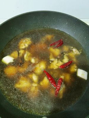 锅中加热水,将干辣椒,葱段,八角,野山椒,姜片放入,加少许料酒酱油。大火烧开,转小火慢炖半小时。