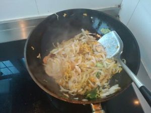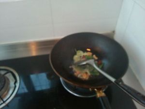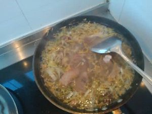 锅中放油,花椒大料爆香捞出来,五花肉切片加葱花姜片生抽爆锅