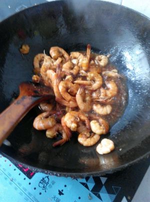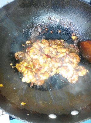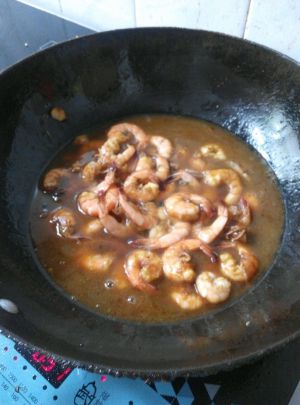 把虾过的虾再次放入锅中翻炒,放入老抽和蜂蜜调好的汁。