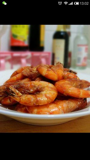 油下锅,爆虾出虾油,放入调料(蒸鱼酱油,番茄酱,糖,陈醋)、大蒜、姜焖10分钟,收汁加葱,ok