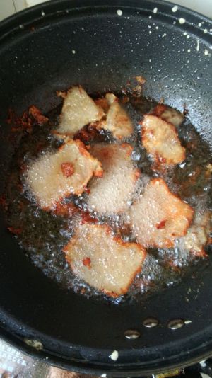 炸至肉变黄捞出,如果喜欢吃硬的捞出肉后可以在回锅炸一遍!