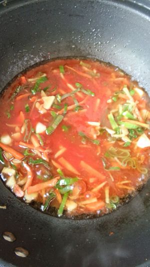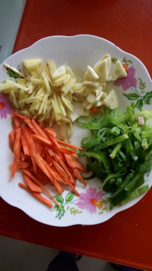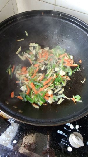 锅里倒油(油不用太多)放入切好的葱丝姜丝胡萝卜丝 翻炒一分钟