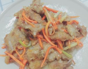 白糖,白醋,水,葱姜,胡萝卜,加热调汁。最后加少许水淀粉勾芡。倒入炸好的肉,颠勺出锅。