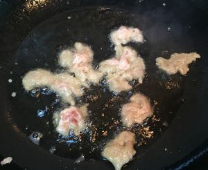 热油炸里脊。自家做,就一盘肉,只放了半壶油,所以记得翻面。