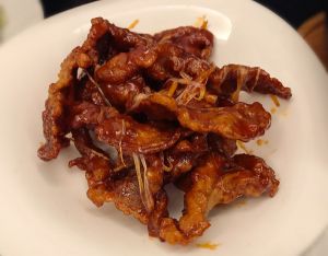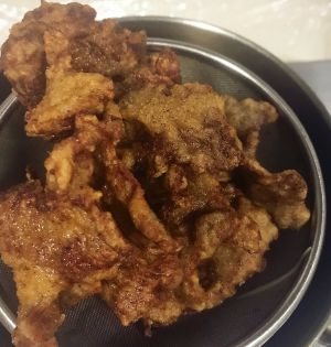 油再加温,9成热时,肉片下锅再炸一次,快速捞出,主要是把表面再炸脆些