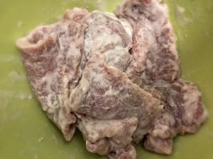 瘦肉砌成1.5厘米片,用料酒码着,少许盐