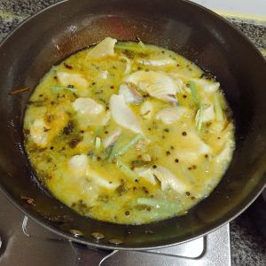 3,炒香后加入开水,待开水煮开放入黄瓜片和鱼片。