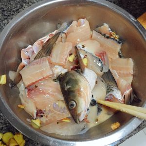 处理鱼:把鱼肉片出来,鱼骨鱼头剁小,待用