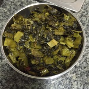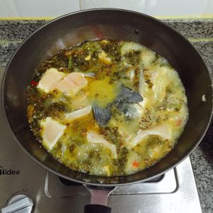 然后开锅烧水放入鱼骨头酸菜放入盐鸡精味精调味
