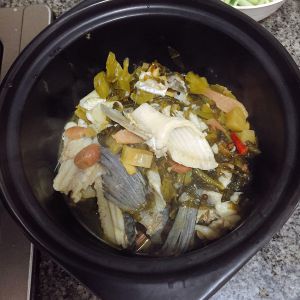 葱姜蒜辣椒爆香,加入酸菜炒香,酱料包,加入开水,加入鱼骨鱼头。