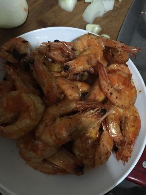 大虾去虾须,虾线,背后侧刀开口,洗干净,控水。锅烧油到八成热,放大虾翻炒,油最好多放些,以便大虾香脆。
