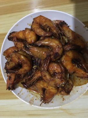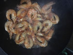 锅内留底油放入葱姜蒜煸炒爆香,倒入调好的料汁。倒入刚炸好的虾,加入一瓶盖料酒,盖上锅盖,中小火焖烧至收汁,出锅前视情况加盐即可。