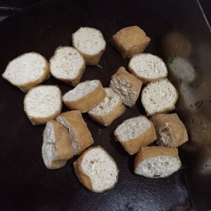 油豆腐中间挖个口将拌好的香菇肉陷塞进豆腐泡里即可。