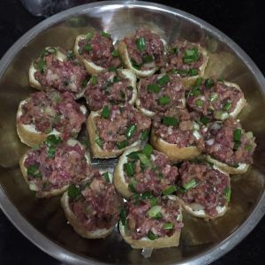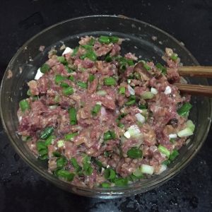 前腿肉买回来后自己剁碎口感佳,放上盐和酱油及生粉拌匀,觉得比较干的话可稍微打点清水或蛋清。