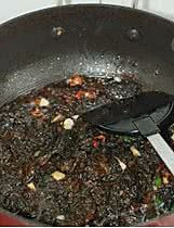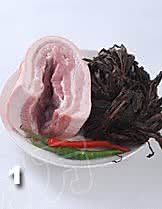 锅底爆香葱,姜,把提前三小时泡好的梅干菜下锅翻炒,放盐,糖,料酒,酱油炒匀,倒进前面煮肉的汤略煮,煮至收汁,出锅时挑出葱,姜
