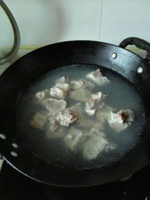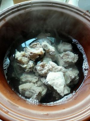 将排骨和适量水倒进锅里煮滚,然后加入山药、栗子,煮20分钟左右。