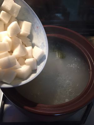 砂锅一次性放足分量的水,想要煲出好汤,中间不能加水哦。把除了萝卜以上的所有材料一起放进锅内,如果想喝比较浓的汤可以等水开了再把材料放进锅内