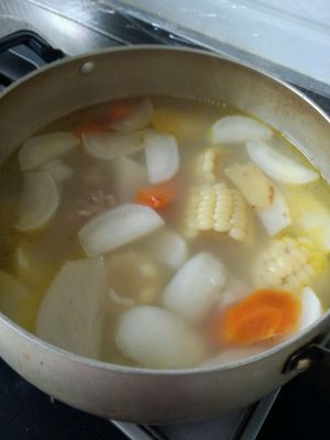 准备辅料,白萝卜滚刀切用盐腌一会去萝卜味(煮前洗一下),或者开水里煮一会也行,玉米红萝卜切块