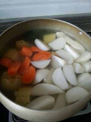 胡萝卜,铁杆山药切块,放进刚煮好汤里继续炖一个小时既可