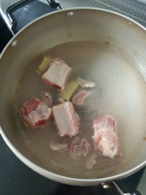 将排骨放进砂锅,到清水,没过排骨,我一般将砂锅加满水,水开后撇去浮沫,然后锅里放花椒,葱段,姜片炖一个半小时。