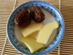 汤锅注入清水烧滚,将焯过水的排骨,蜜枣,姜片,荷叶—起放下锅,下2滴米酒,大火烧开,煮15分钟,中火15分钟,小火30分钟。