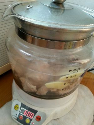 把所有食材放进电饭锅,加3片姜片,我是一人喝,晚上跟早餐喝,加入两大海碗的水,开始按煲汤键,2小时出锅,喝的时候再自行加盐。